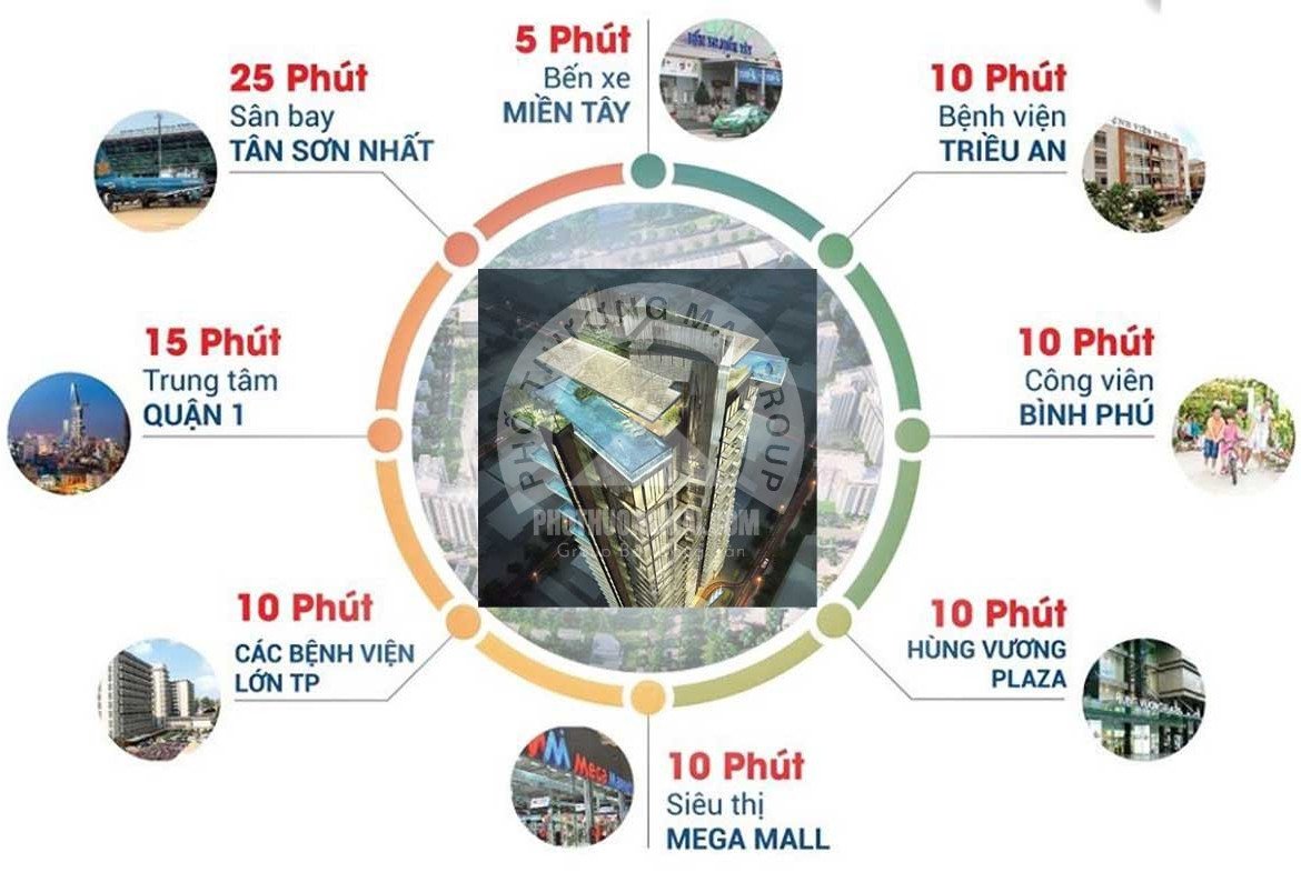 - Tâm điểm tiện ích ngoại khu: Trong bán kính 3km từ vị trí dự án, cư dân thừa hưởng trọn vẹn hệ sinh thái tiện ích sầm uất như Aeon Mall Bình Tân, Bệnh viện Quốc tế City (CIH), Bệnh viện Triều An và Bến xe Miền Tây.